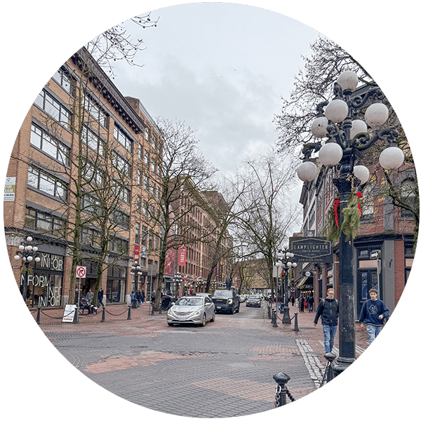 The oldest area has cobblestone streets, Victorian architecture, and the iconic Steam Clock. It blends historic charm with trendy shops, restaurants, and lively nightlife.