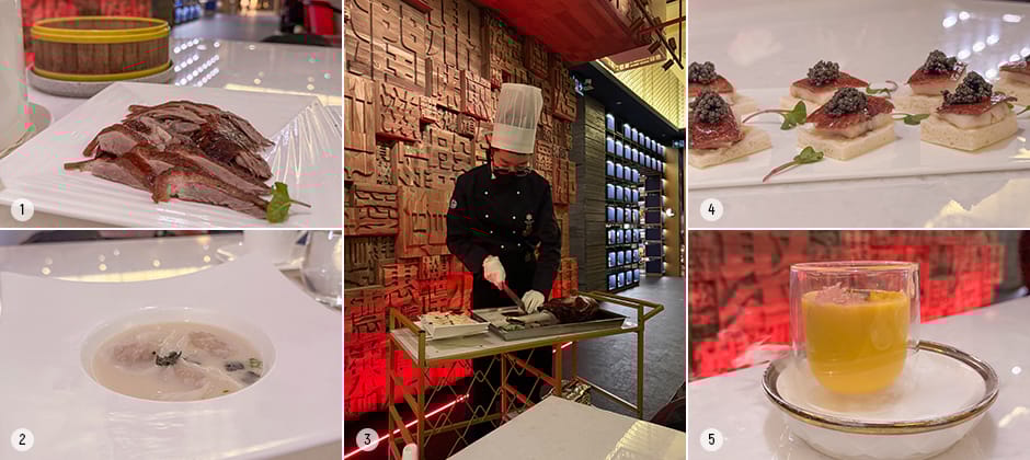 The menu is easy to navigate, offering a la carte dishes and a tasting menu. I got a few items from the regular menu because I prioritized trying a Quanjude Signature Premium Caviar Beijing Duck (it takes around 55 Minutes to cook) • Images 1,3,4. When it is ready, the server carves it tableside. You get to watch the whole process, which is fun.