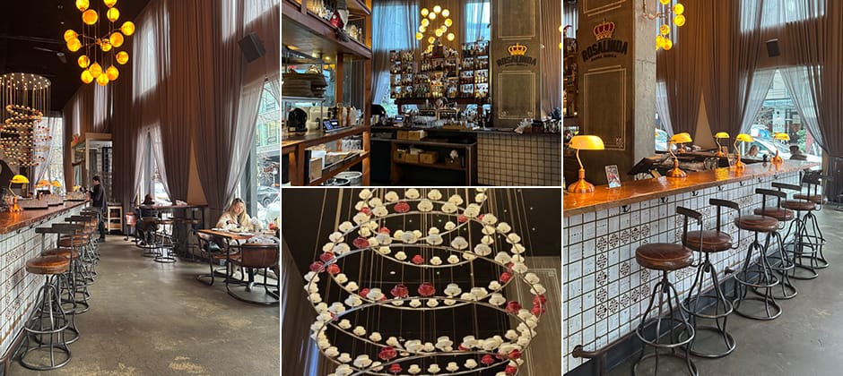 The ambiance is modern and warm, with stylish decor, beautiful lighting, and a lively atmosphere. One detail I love the most is the lighting design. Swirling lighting resembles a cup with a saucer, adding a unique touch. The small lamps on the bar tables create a soft glow, making it the perfect spot for a quiet coffee and a good book or an intimate date over cocktails.