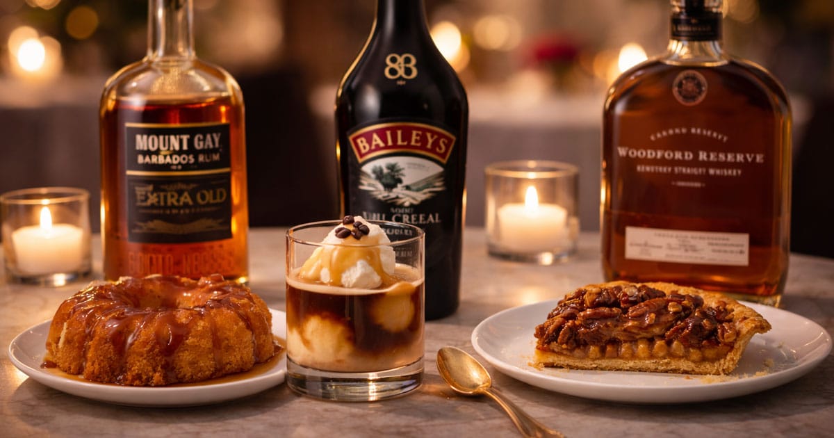 Classic examples include tiramisu with liqueur or rum, rum cake, crème brûlée infused with liqueur, zabaglione, trifle, or ice creams made with Baileys, amaretto, or wine reductions.