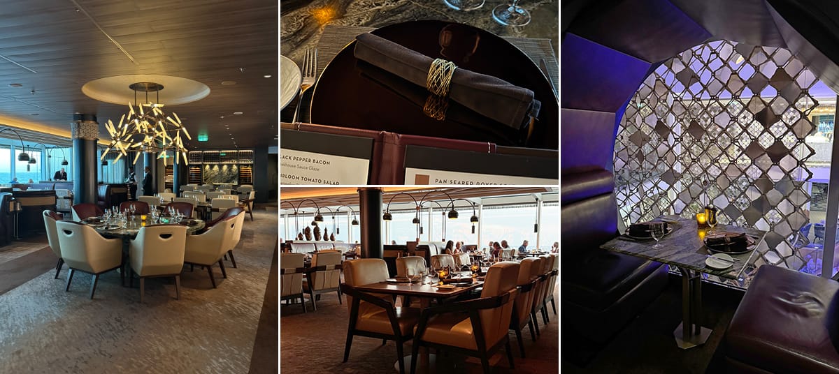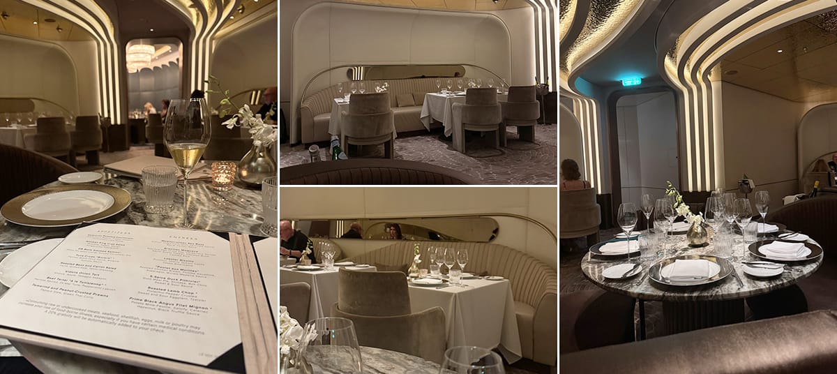 The interior feels elegant and more formal compared to other restaurants on the ship, with darker tones and a more traditional layout. Service here follows a classic steakhouse style.