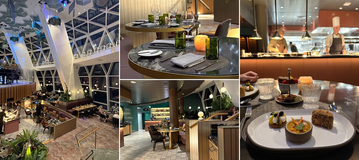 Eden Restaurant is one of the most distinctive dining venues on Celebrity Ascent, designed as an experiential restaurant where food and atmosphere are connected. The space feels distinct from the rest of the ship, featuring large windows, an open area, and a modern design in green and brown hues.