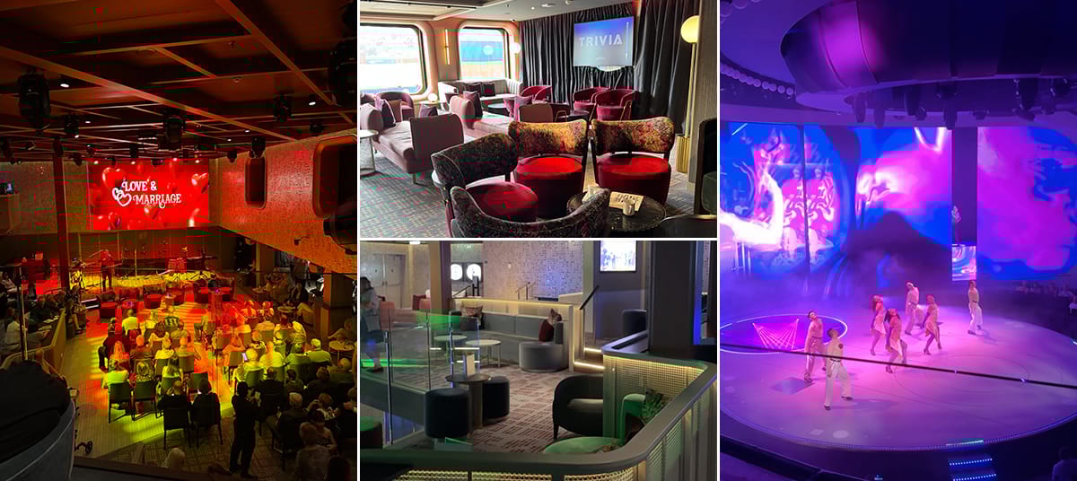 The main theater hosts evening shows, including vocal performances, dance shows, and production-style entertainment. The schedule changes throughout the cruise, so there is usually something different to see on different nights.