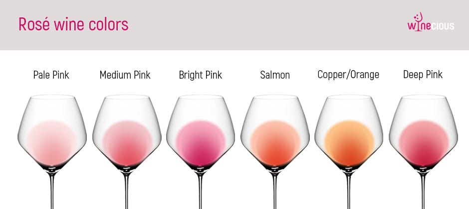 Salmon/copper/orange: Often from Pinot Noir or aged rosés